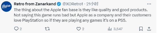 有玩家分析道,苹果的粉丝普遍喜欢高质量的产品,和PlayStation的用户画像高度重合,他们想玩游戏的话大概率会在PS5上面玩。