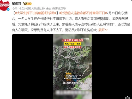 据相关消息,在山东烟台,一名大学生于近期在户外骑行时不慎摔下山沟,消防员在接到报警电话后迅速赶到现场,先拿绳子将自行车给拽了上来。报警路人表示当时听到有人在喊“你好”,还以为是有人在聊天,没想到是有人摔下去了。