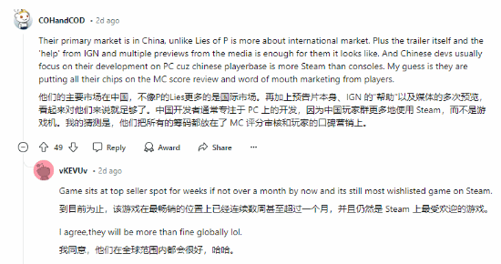 对此,有网友回应表示,《黑神话:悟空》的主要市场在中国,不像《匹诺曹的谎言》针对国际市场。再加上预告片本身、IGN的“帮助”以及媒体的多次试玩,这对他们来说就足够了。中国开发者通常专注于PC开发,因为中国玩家用steam的更多,主机占少数。开发者们可能把所有的筹码都压在了MC评分以及玩家口碑上。