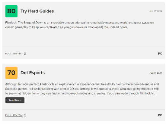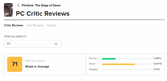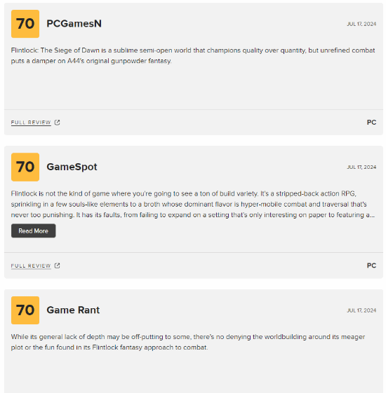 据了解,游戏《燧石枪:黎明之围》已于近日正式发售,首发同步加入XGP,而该作的媒体评分也已解禁,据了解,该作的M站评分也已解禁,目前媒体均分71分,收录17篇评测。5条好评,12篇中评,让我们一起来看看媒体是怎么评价这款游戏的吧。