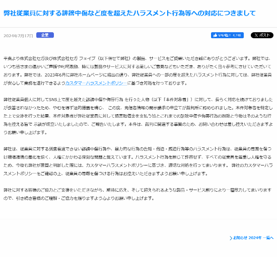 世嘉在声明中重申,这些针对员工的诽谤、威胁和恐吓行为严重侵犯了人权,也会让员工的尊严收到打击。这种行为他们绝不容忍,会采用任何手段来进行扼制。同时,世嘉也推出了【客户骚扰政策】,希望能够起到保护员工的作用,让骚扰员工的人付出代价。