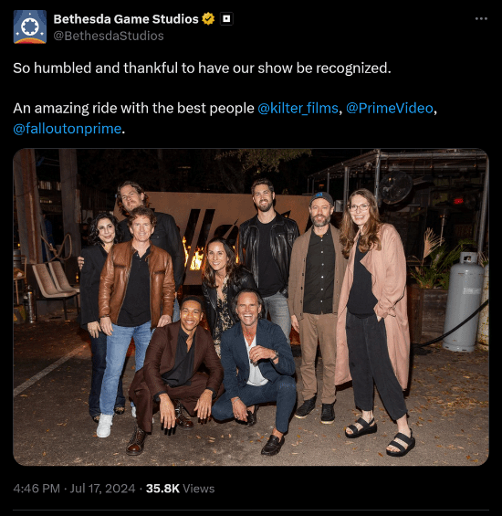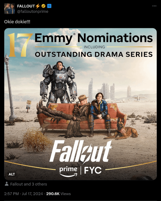 据悉,亚马逊真人改编剧集《辐射》自开播以来便收到了广大网友的欢迎,而据相关消息,该剧距今为止已获得了16项艾美奖提名,其中包括两项大奖:最佳剧情类剧集奖和沃尔顿·戈金斯的最佳剧情类剧集男主角奖,对此,该剧集的官方以及B社,都发文对其进行了庆祝,B社表示:我们的节目得到认可了,我们感到非常荣幸和感激。