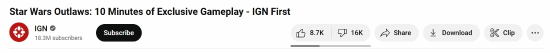 据相关消息,IGN已于此前在社交平台上发布了《星球大战:亡命之徒》的前十分钟游戏演示,撰写本文时,IGN在Youtube发布的视频获赞数为8.7k,但点踩数量却几乎是其两倍,达到了16k,由此可见,该演示的反响并不乐观,而育碧也在最近重申该游戏仍将在8月30日如期发售。