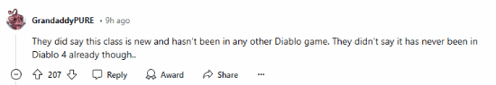 在评论区里,有玩家也开玩笑表示:“官方确实说过这个职业是新的,在其他《暗黑破坏神》游戏中都没有出现过,但官方并没有说它不会出现在《暗黑破坏神4》里。”