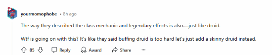 “官方描述职业机制和传奇效果的方式也像德鲁伊一样,就像他们说:“给德鲁伊打Buff太难了,我们就加一个瘦小的德鲁伊吧。””另一位玩家回答道。