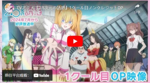 据了解,改编自桥本悠创作的同名漫画的动画《2.5次元的诱惑》已于近日正式开播,而官方也在第1集"异次元の新入生"播出后发布了无字幕的片头曲和片尾曲影片,同时,原作者桥本悠为庆祝首集播出,还在官方账号上发布了祝福留言。官方表示,未来将持续公开更多相关信息。
