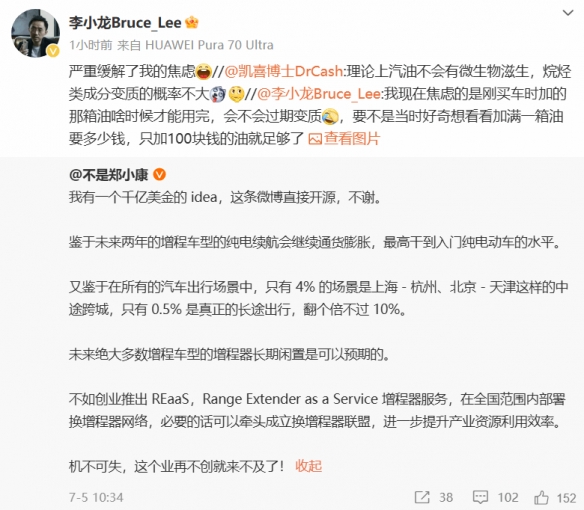 据相关消息,华为终端BG CTO李小龙于近期在社交平台发文挺增程车,其在文中表示:“增程车无论便宜多少钱我都不会把增程器卸下来。”,据了解,他本次发文的起因是汽车博主“不是郑小康”分享了一个千亿美金的idea”,让我们一起来看看这位博主当时是怎么说的吧。