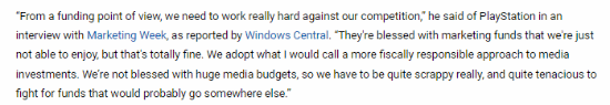当谈到PlayStation时Marketing Week表示:“从资金角度来看,我们需要非常努力才能与竞争对手抗衡。他们拥有我们无法享受的营销资金,但这完全没问题。我们采取了一种更具财务责任感的媒体投资方式。我们没有巨额的媒体预算,所以我们必须非常拼命,去争取其他地方的资金。”