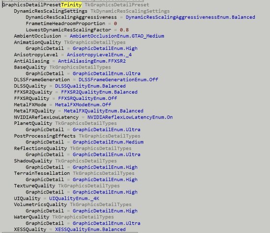 具体来看,这些代码显示的内容是针对“Trinity”的图形预设,这可能意味着Hello Games已经在为PS5 Pro优化《无人深空》的画面了。