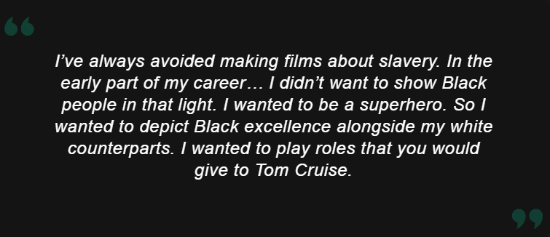 他表示:“我一直避免拍摄有关奴隶制的电影。在我职业生涯的早期......我不想以这种方式来表现黑人。我想成为一个超级英雄。所以我想把黑人的优秀品质和白人的优秀品质结合起来,我想扮演汤姆·克鲁斯那样的角色。”