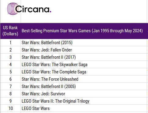 据相关消息,市场研究公司Circana于近期发布了美国十大最畅销的《星球大战》游戏排行榜,本次榜单中销售额的范围为1995年1月至2024年5月,其中《星球大战:前线》、《星球大战绝地:陨落的武士团》与《星球大战:前线2》分别位列排行榜前,让我们一起来看看具体榜单吧。
