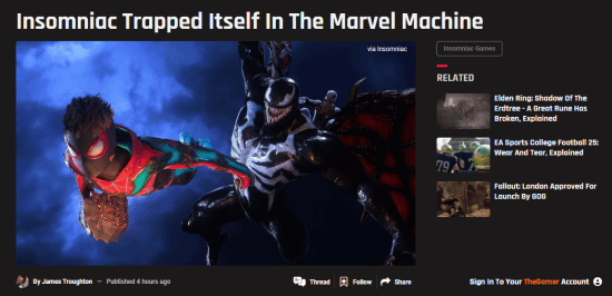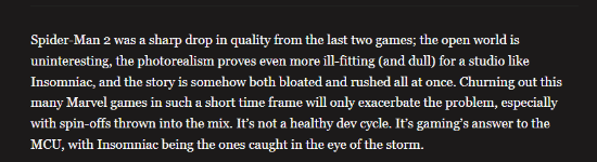 作者表示失眠组有能力制作各种类型的游戏,例如FPS、动作开放世界甚至平台游戏。其创作力理应得到更广泛的发挥,而不是局限于漫威题材。作者认为这并不是一个健康的开发规划,并以《蜘蛛侠2》举例,认为这款游戏质量较前作有所下降且开放世界缺少乐趣,在如此短的时间内推出这么多漫威游戏只会加剧这个问题,尤其是加上衍生作品。