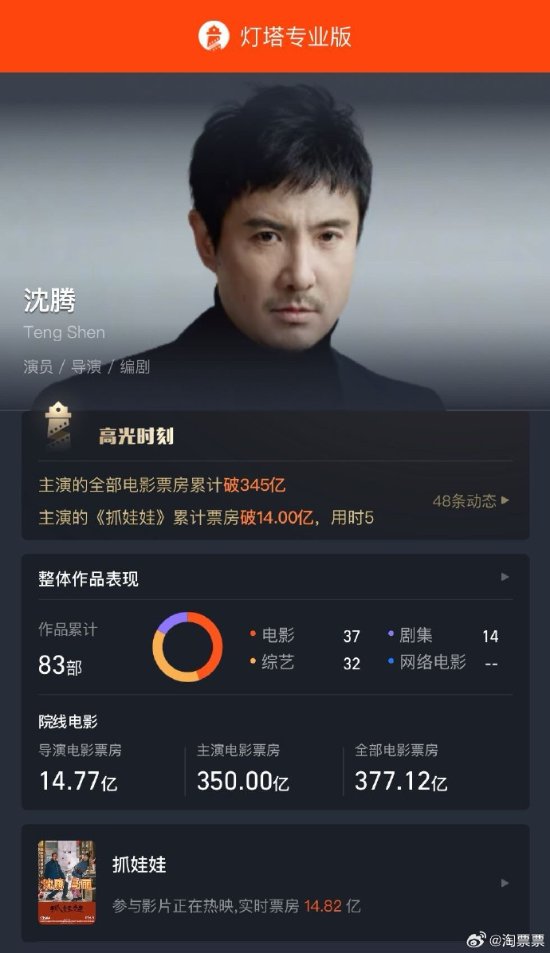 据相关消息,由沈腾马丽主演的电影《抓娃娃》已于此前正式上映,而该片的票房于近期突破14亿元,位列2024暑期档票房第一,而据据灯塔专业版的数据,沈腾凭借这部电影,生涯主演电影票房突破350亿,也是中国影史首位票房突破350亿主演,让我们一起来了解一下吧。