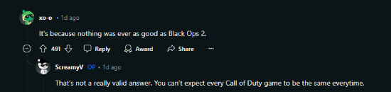在评论区,《使命召唤:无限战争》《使命召唤:二战》等游戏受到了很多批评,但大多数粉丝都认为《使命召唤:先锋》是最糟糕的。有粉丝指出,很多仇恨都源于对旧游戏(例如黑色行动2)的怀念,但确实其中一些游戏的多人游戏或战役功能没有达到预期。