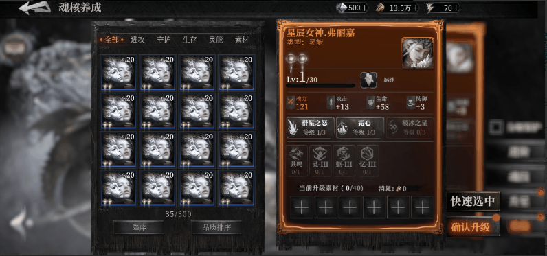 升星这个提升比较考验魂核本身的品质,品质越高的魂核升星能拥有更高的星级,魂核进行升星之后可以根据相应的星级来提高魂核技能等级,增加技能效果,解锁新的魂核追忆,升星的方式是通过吞噬同等的魂核。进阶也是看重魂核本身的品质,品质越高的魂核觉醒的技能会越强大,并且可以不断的提高本身的属性,进阶的方式是通过分解消耗同等品质的魂核进行进阶。