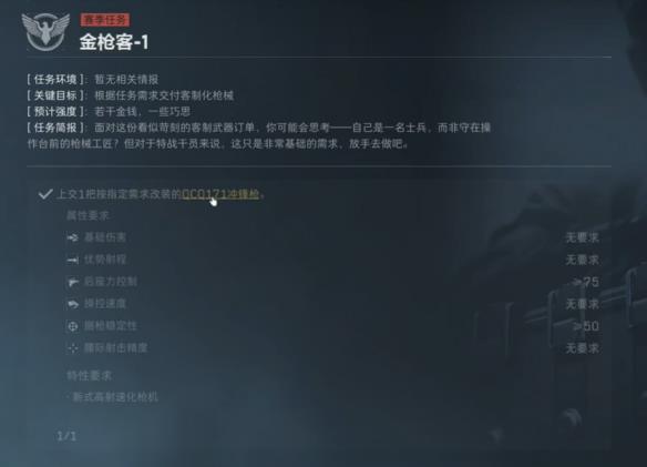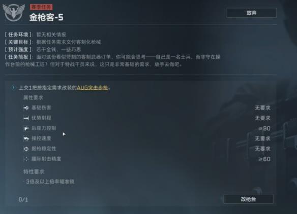 金枪客1需上交满足射程≥80、后座≥80的满改MK47(改枪码6HT8U5807Q7T5FV6P3HOV,成本约25万)。