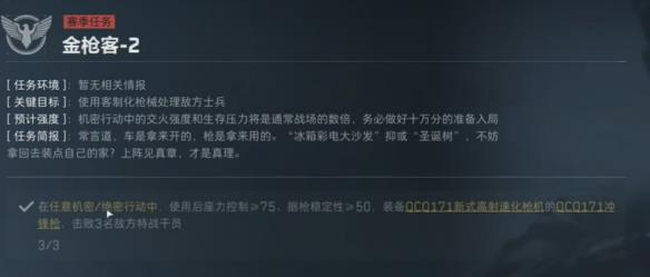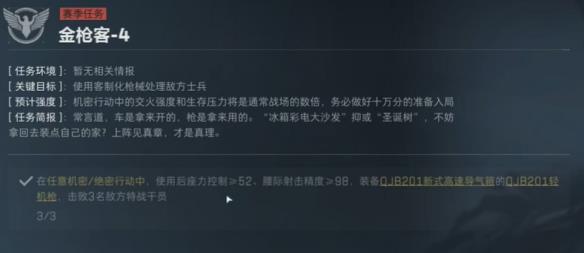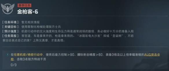 金枪客2需在战备≥75万的机密/绝密行动中用MK47击败3名干员。