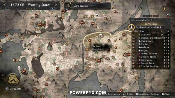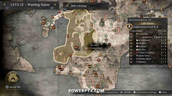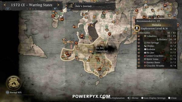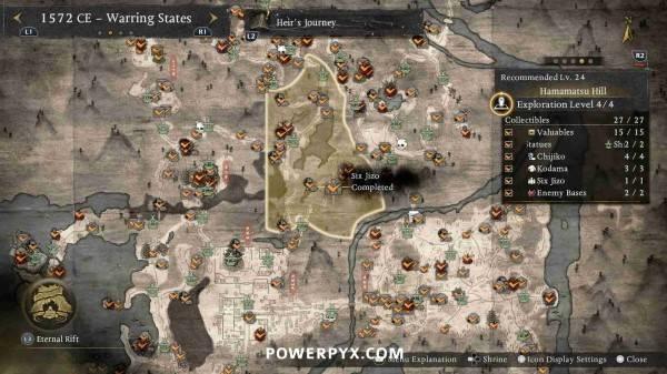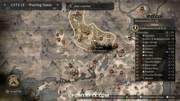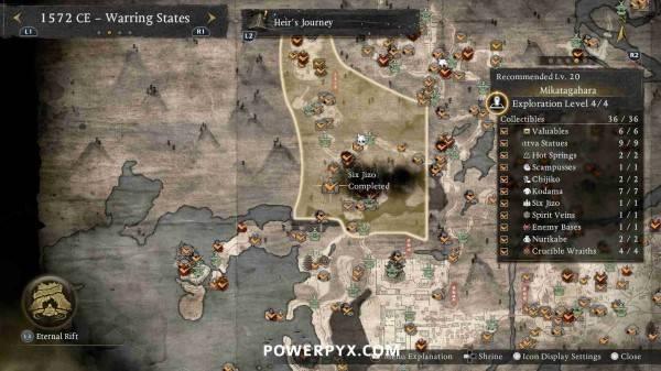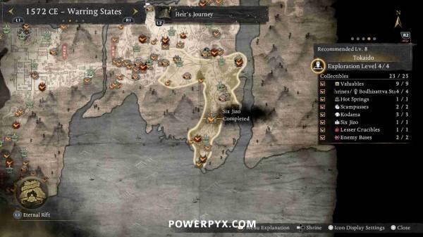 在一个区域内通过寻找其他收集品使探索等级达到4级时,六地藏的位置会以白色图标自动标记在地图上。在地图上按【R2】可以查看每个区域的收集品统计,可以对六地藏图标设置标记并跟随罗盘轻松找到。