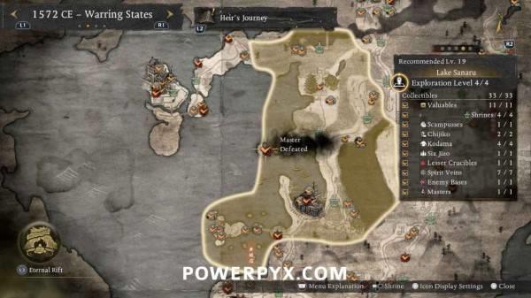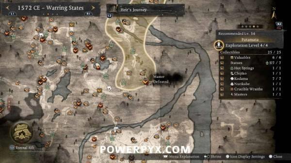 在一个区域内通过寻找其他收集品使探索等级达到4级时,高手的位置会以红白人像图标自动标记在地图上。在地图上按【R2】可以查看每个区域的收集品统计,可以对高手图标设置标记并跟随罗盘轻松找到。
