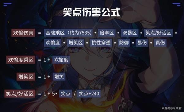 欢愉伤害=基础乘区(约为7535)*倍率区*双爆区*(1 笑点区)*欢愉度*增笑度*抗性穿透*防御*易伤*真伤。