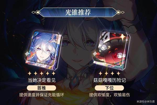 虽然下位光锥菇菇嘎嘎历险记数值确实很高,能给爻光提供20%欢愉度并通过爻光战技给主C提供4%欢愉度,以及释放欢愉技时给敌方全体增加10%欢愉易伤,数值上确实差距不大,但是实际循环上落后太多,可能会掉大招的光环和易伤覆盖,只是为了光锥数值有点捡了芝麻丢了西瓜的感觉。满叠菇菇嘎嘎历险记对主C的提升为专武的97%。该光锥可以在混沌回忆商店直接购买,因此不推荐使用3星光锥。