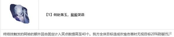 爻光的终结技首先会给5个笑点和一个阮梅终结技同款光环效果,覆盖3回合。60笑点的情况下5个笑点的提升幅度约为3.2%,而这个终结技的抗性穿透光环能够覆盖赠送的阿哈时刻。