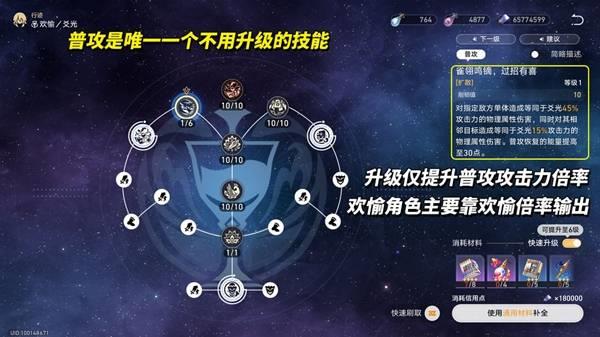 「欢愉」角色的伤害主要和欢愉技能倍率挂钩,爻光的普攻升级仅提升攻击倍率,对伤害的提升基本无影响,因此普攻可维持1级。其余技能尽量升满,涉及增幅数值或欢愉倍率等。