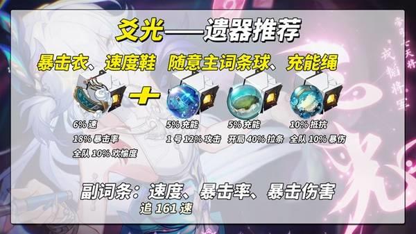 遗器推荐组合:隧洞4件套「应天涉远的卜者」暴击衣、速度鞋 位面2件套「沉陆海域露莎卡/生命的翁瓦克/折断的龙骨」随意词条球、充能绳。副词条重点关注“速度、暴击率、暴击伤害”。