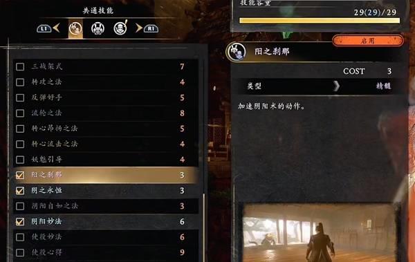 通用技能:阳之刹那、阴之永恒、阴阳妙法,化身不坏之法,阳之刹那后期可以换成阴阳自如之法,其他随意。