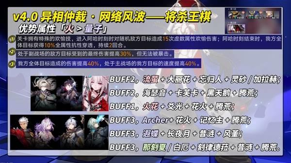 对局【花火大会@Official】,优势属性「火>量子」,环境异常“我方受击随机5%或10%行动延后,我方初始伤害降低40%,每施放1个终结技移除20%伤害降低效果”。对局存在较多对3环境,扩散型输出优势大。