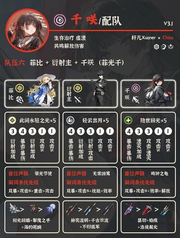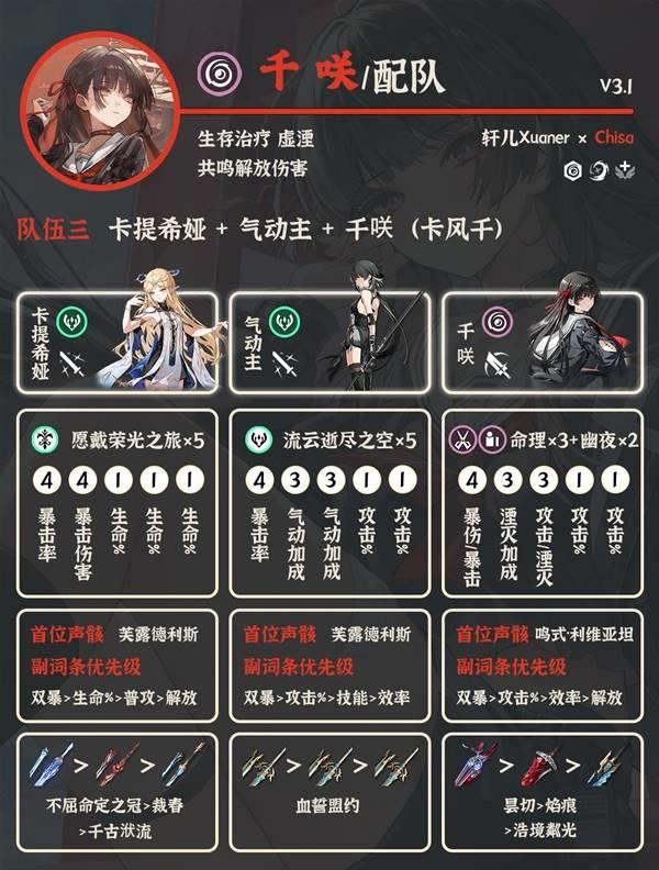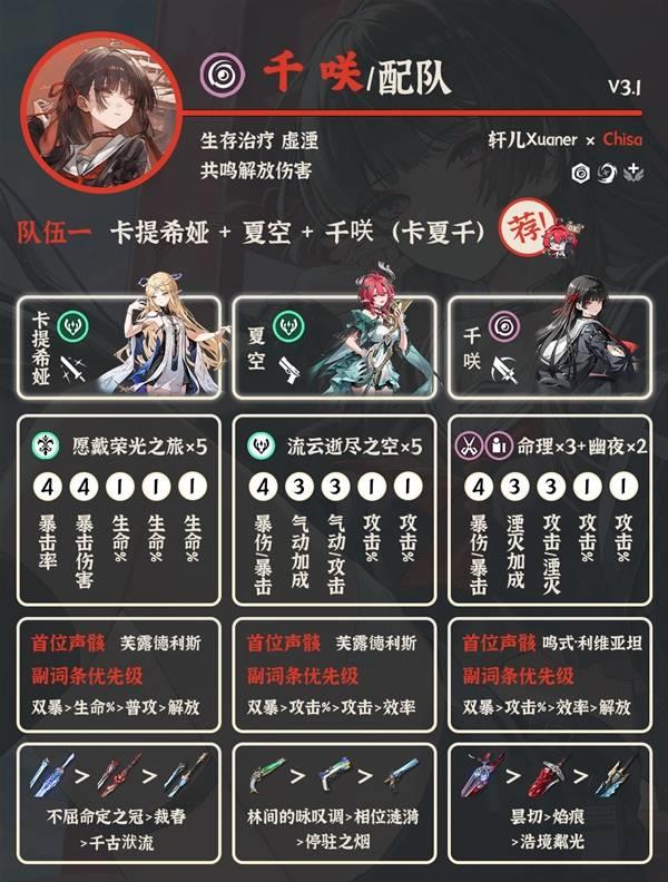 ①卡提希娅 夏空 千咲:当前版本千咲最佳配队。卡夏千是目前鸣潮顶级队伍,千咲有专武更好,没有专武的话千咲也可以用气动主代替。