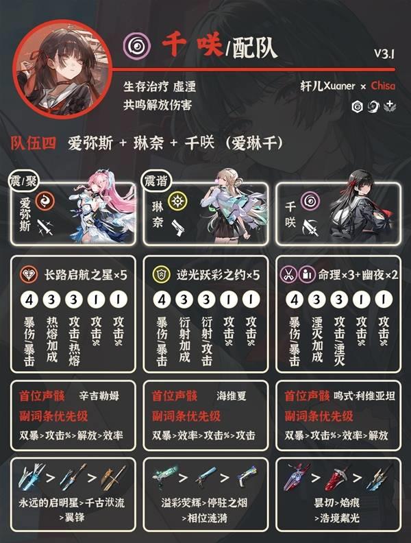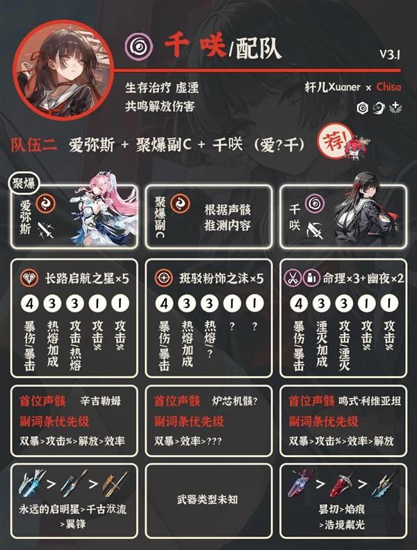 ②爱弥斯 聚爆副C 千咲:需要等聚爆副C组完整聚爆队,预期也是顶级队伍。没有琳奈莫宁,抽了爱弥斯的漂泊者可以考虑。