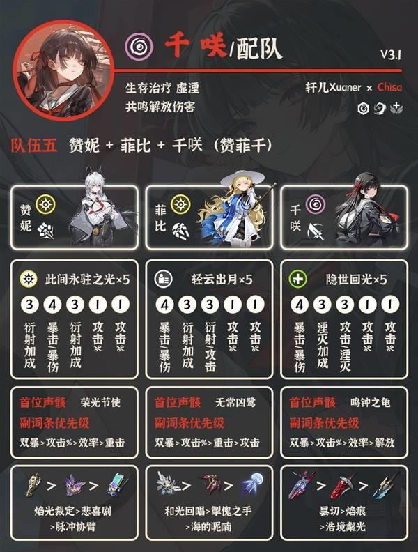 ⑤赞妮 菲比 千咲:赞菲优先搭配衍射主/守岸人这些,如果实在不行再考虑千咲。