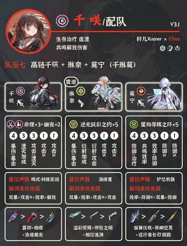 ⑦高链千咲 琳奈 莫宁:抽了高链千咲的厨子想用来做主C可以用这套,琳奈莫宁提供非常可观的增伤,琳奈延奏可以加共鸣解放加深给千咲吃。