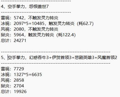 第一轮测试结果如图。有三种属性吃到灵力转炎的情况下,凶王7 悲剧英雄3的总伤害比另外两种配装高40%多。表现最差的是第3种组合——风魔威名的幻术伤害(技)对幻术的加成不如幻惑吞牛5,更别说后者还能加成阴阳术。以上是没有考虑混沌的情况。实战中凶王套加异常状态积累和混沌时间,甚至能顶着对应的抗性上属性,理想情况下更适合连续幻术 /阴阳术打爆发,不过这对灵力管理有一定要求。但目前看来,当攻击面板进一步提升后,凶王7会遇到单发属性伤害过高导致卡灵力上限无法触发的情况(这个在后面的拳力测试会看到)。