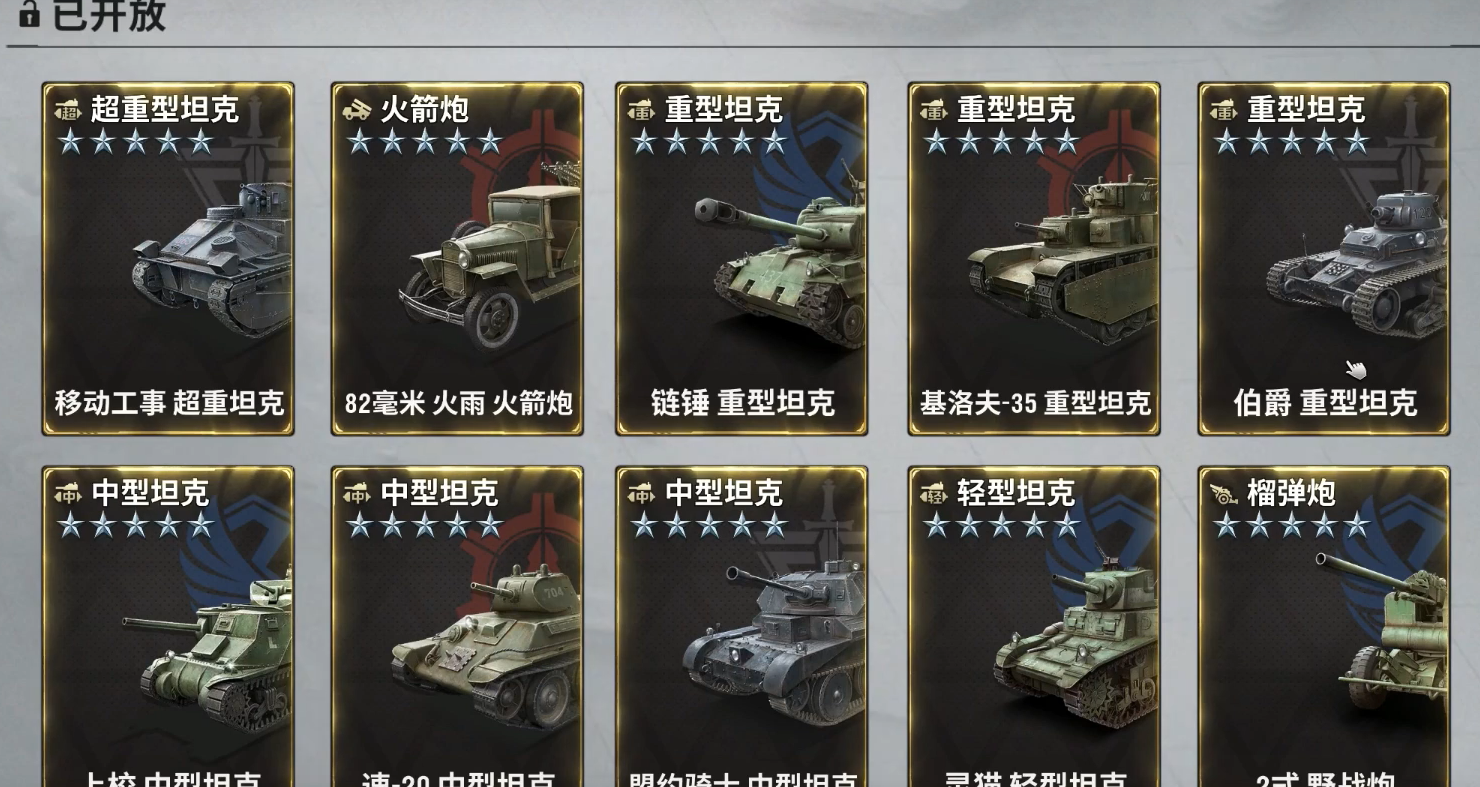 军备展览馆中车辆单位主要指坦克、装甲车和火箭炮,其中坦克有轻、中、重三种,它们是游戏中最重要的单位,可以满足玩家对防御和输出的一切基本需求。轻型坦克行动迅速,可以在敌方后方进行突袭;重装战车行动缓慢,但拥有极强的攻击力和防御力,在团战中能撑起整条防线,进可攻退可守,战损比也不高;而中级坦克作为主战坦克,是一个可以同时完成所有任务的万金油角色。火箭炮和榴弹炮则是玩家主要的远程火力输出,可以搭配有相应技能的军官如舍普琴科,打出巨量的伤害。