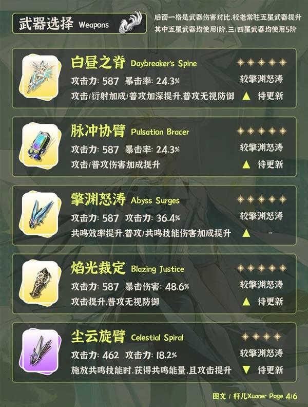 ④陆·赫斯武器首选专武白昼之脊。其次新常驻五星也是非常适配陆·赫斯,如果资源紧张可以先用着。老常驻五星和赞妮专武同样可以提供部分普攻收益。其余五星专武暂不推荐。四星武器的话可以考虑尘云旋臂。
