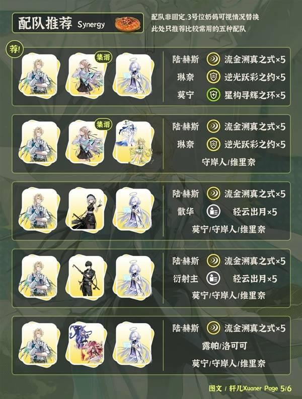 ⑤陆·赫斯是集谐普攻主C。最佳搭配是琳奈和莫宁,其中莫宁也可以换成其它奶妈。如果没有琳奈,可以考虑搭配散华/露帕/洛可可这种普攻加深副C。或者衍射主6链提供衍射减抗。配队比较亲民。
