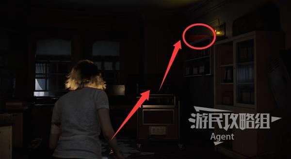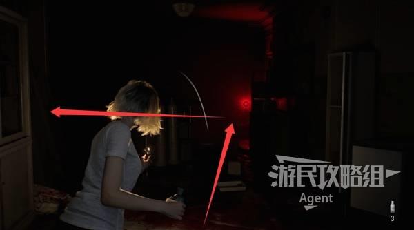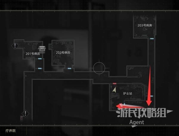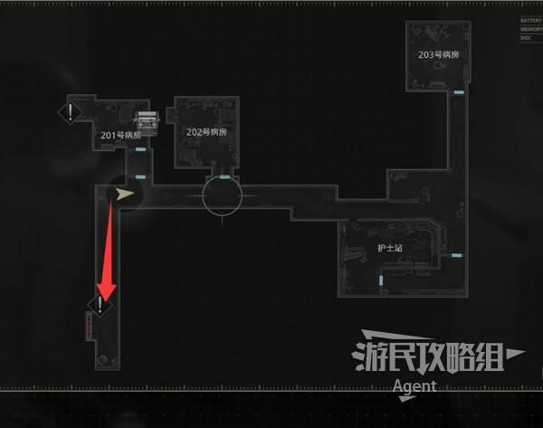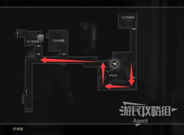提前打开201与203病房的灯,回到东侧,红灯旁桌上有个空瓶,往南到下图位置触发剧情,见到怪物“女孩”。