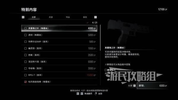 【速度狂人】20000CP(4小时内取出厄尔庇斯并通关) 【从不嗑药】35000CP(不使用药草/注射器通关) 【极简主义者】35000CP(不使用采血器通关)CP点数购买推荐推荐优先将CP点数用于战斗难度较高的格蕾丝篇,例如兑换【无限耐久小刀-虎彻】或前期比较好用的【芙蕾雅之针】,以及能大幅降低攻略难度的【无限弹药(枪械)】和【无限弹药(RPG-7)】。【无限耐久斧头】的性价比不是很高,如果CP点数不是很充裕的话,不推荐优先解锁。