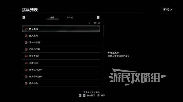 ※挑战的完成状况所有存档共通,每项挑战只能完成一次,已经完成的挑战无法在其他存档中重复完成。也就是说,完成同一个挑战只能获得一次CP点数,重复完成不会再获得CP点数。但是,累计类的挑战可以通过反复存读档来累积。