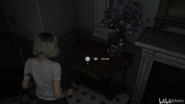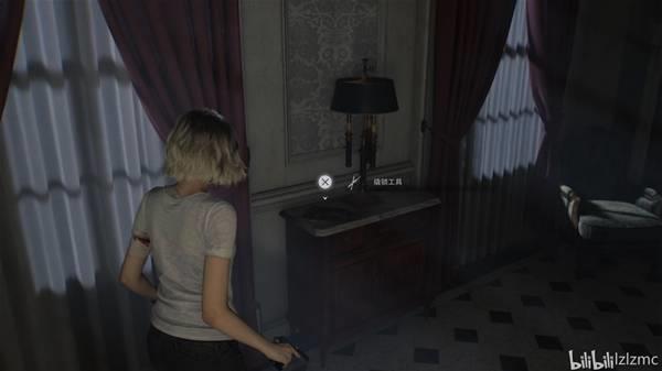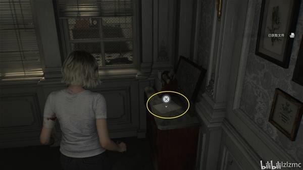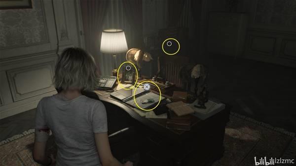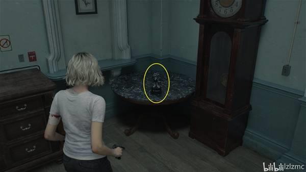 重新回到等候室东侧楼梯处,在钟旁边的桌子上,使用手枪打掉黑白浣熊先生3。