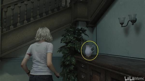 向左看,楼梯旁如图的柜子上,有一个白色小花瓶,打碎找到古钱币19。