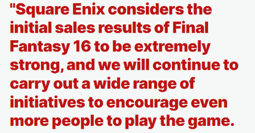 近日,开发商Square Enix接受了IGN采访回答了有关销量的问题。SE认为《FF16》的初期销售业绩实际非常强劲,团队也将继续采取广泛的举措来鼓励更多人购买游玩这款游戏。