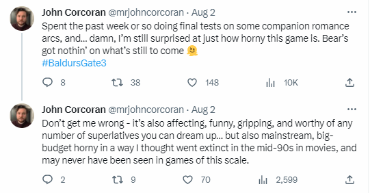 Corcoran在推特上写道:“过去的一周左右的时间里,我做了一些伴侣浪漫剧情的最终测试,然后……该死,我还是惊讶于这个游戏有多刺激。熊对未来根本一无所知。”
