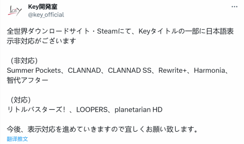 开发商Key社今日发文称,其发行在Steam上的一些主要游戏不支持日语。如《Summer Pockets》《CLANNAD》《CLANNAD SS》《Rewrite 》《Harmonia》《智代After》 ???等。但官方计划在未来为这些作品添加日文支持。
