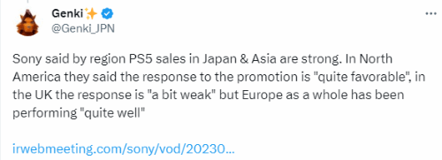 在后续的补充文档中,索尼根据不同地区划分,简述了各地第一季度的PS5销售情况。索尼表示PS5在日本和亚洲地区的销量强劲;在北美和欧洲地区,由于近期开启的促销活动,销量表现也很可观,但在英国反响稍弱。