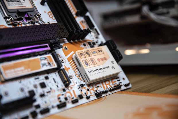 外观细节处理上,COLORFIRE B760M-MEOW WIFI D5橘影橙主板将“橘宝”元素融入散热装甲、定制电池、音频屏蔽罩,南桥散热装甲升级为“橘宝的游戏装备库”。