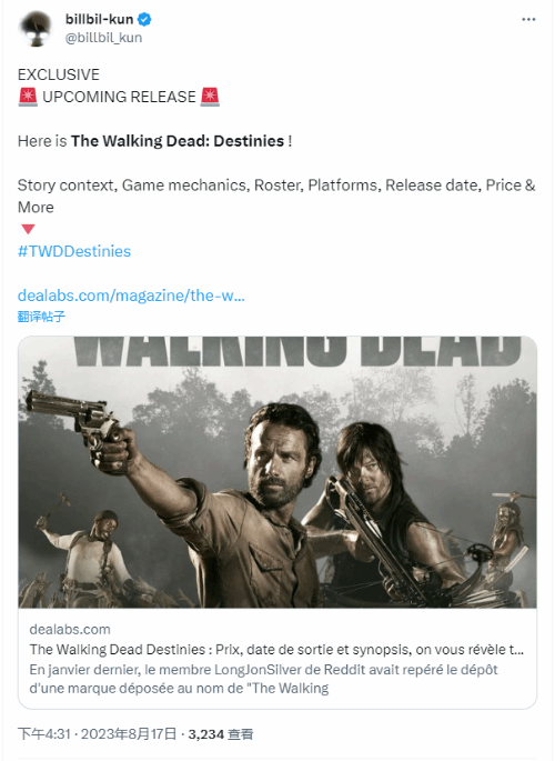 同时舅舅也爆料了游戏的登录平台和发售时间,《行尸走肉:命运》是一款多平台游戏,可在PC(通过 Steam)、Nintendo Switch、PS5和Xbox Series X|S以及老一代游戏机、PS4和Xbox One上游玩,发售时间为2023年11月14日,售价为49.99美元。