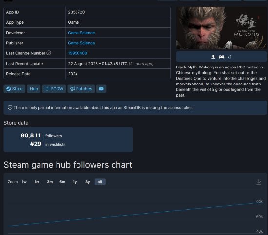 《黑神话:悟空》试玩活动已经结束,玩家们悬着的心也随着试玩体验放出而放了下来,直观的表现就是本作在Steam的愿望单人数直接翻倍,从昨日的40000多已猛增至80811人,在Steam愿望单榜排名29位,位居上榜国产游戏的第二名——仅次于《动物派对》。